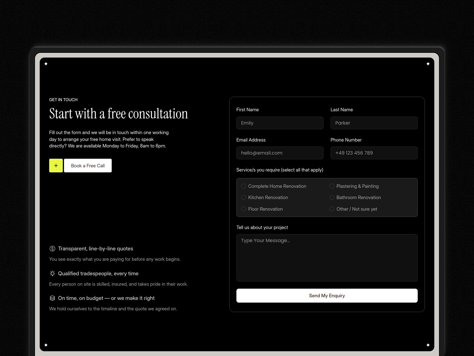 Conversion-focused structure — Sections are ordered intentionally: build trust first, show the work, handle objections, then ask for the enquiry.