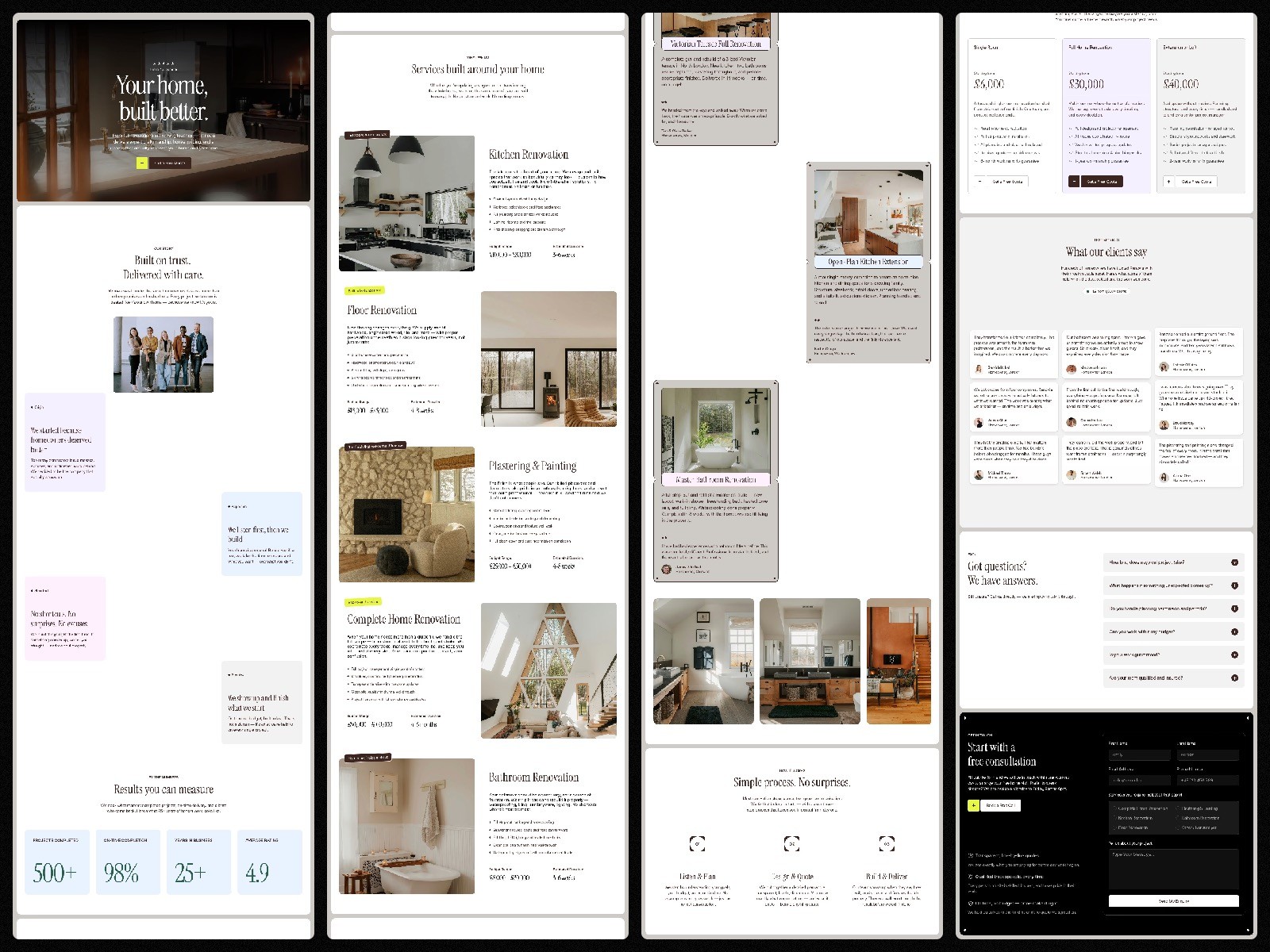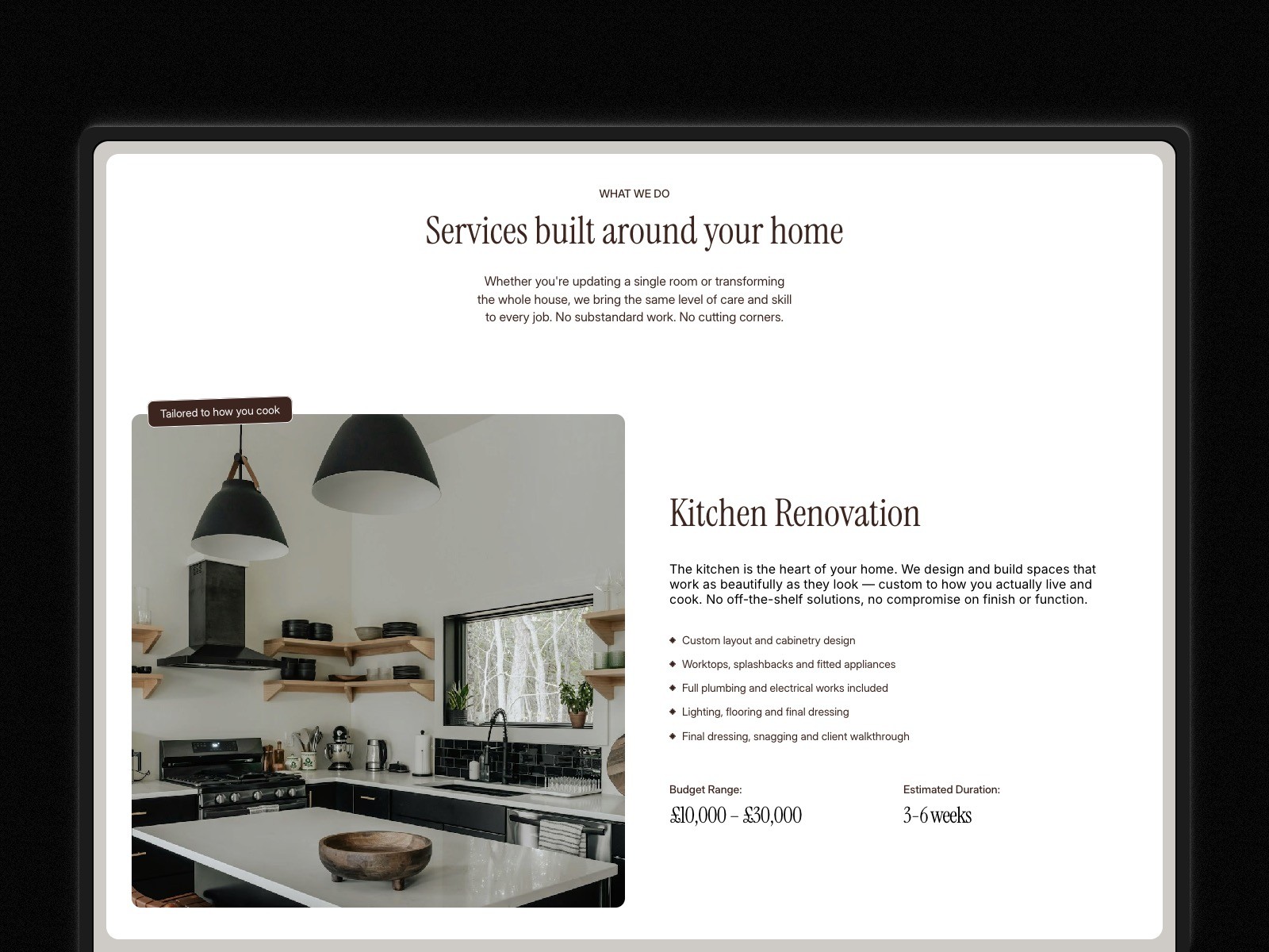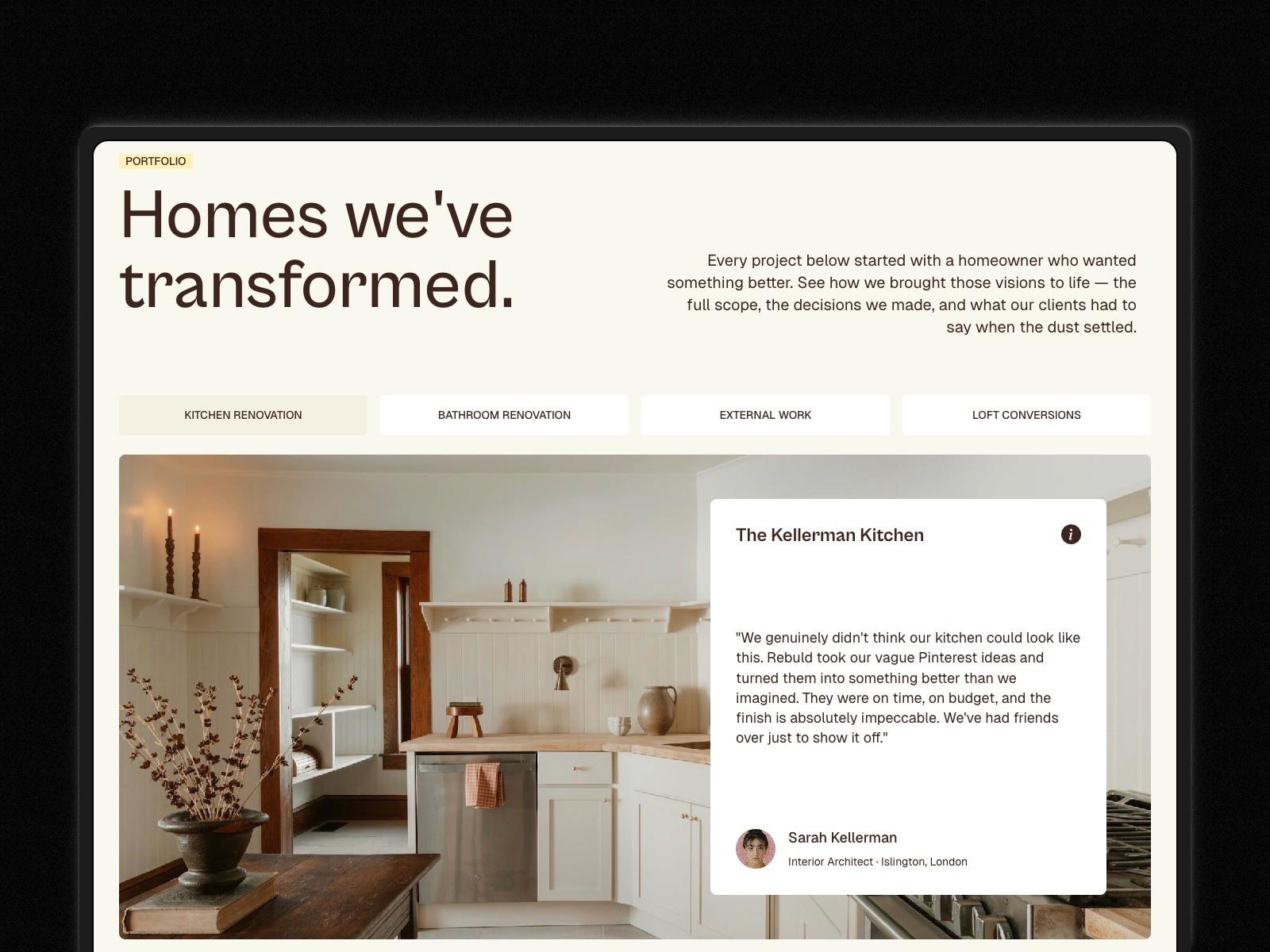 Every section has been built around how renovation clients actually make buying decisions. They want to see your work, understand your services, trust your credentials, and contact you easily. Rebuld guides them through all of it on a single, beautifully structured page.
